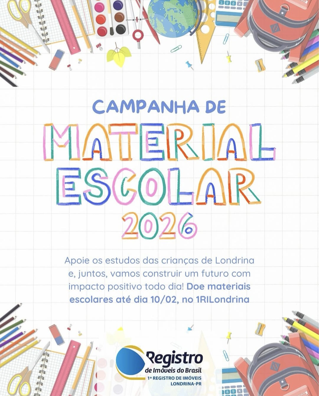 Até 10/02, doe materiais escolares novos ou em bom estado. Cada gesto de cuidado contribui para um início de ano letivo mais digno e cheio de oportunidades, transformando positivamente a vida de muitos estudantes.
